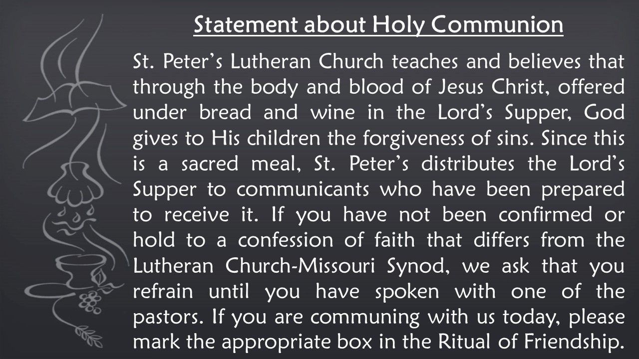 If you plan to bring family members or guests who are not currently members of an LCMS congregation to a service where Holy Communion is offered, please invite them to speak with one of our pastors before Thursday and to review the communion policy below. Those who are not communing are still warmly welcome to come forward to receive a blessing.