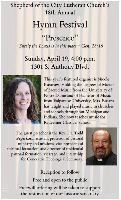 Shepherd of the City Lutheran Church will host its 18th annual hymn festival on Sunday, April 19, at 4:00 p.m., at 1301 S. Anthony Blvd. This year's theme is “Presence,” based on Genesis 28:16, “Surely the LORD is in this place.” The featured organist will be Nicole Busarow of Redeemer Classical School, and the guest preacher will be the Rev. Dr. Todd Peperkorn of Concordia Theological Seminary. A free-will offering will be accepted at the door to help the congregation pay for much-needed building repairs.