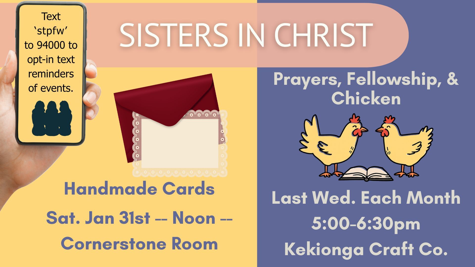 *One thing that makes Sisters in Christ special is that we’re lay-led. There’s no one single leader, which helps share the load together. Everyone is invited to bring ideas, host activities, or share devotions. If you have something you’d love to offer, contact Amy Widener in the church office to reserve space and discuss next steps.