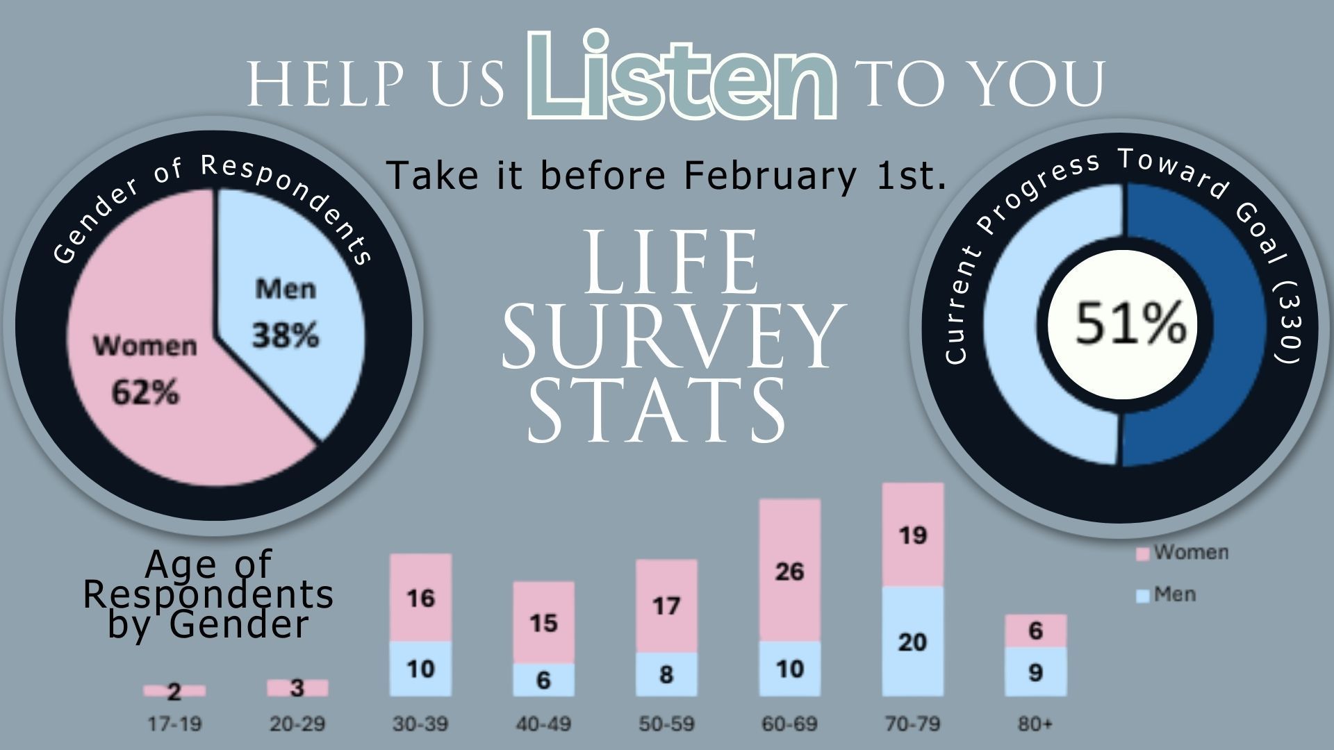 Thank you also for participating in the Life Survey. Our goal is about 330 completed surveys, and we’re currently around 43% of the way there. A key focus right now is encouraging more men to respond. So far, 52 men and 89 women have completed the survey. It may be that in many households, only one spouse has participated. Please help us spread the word: if you’re married, both husband and wife should take the survey.